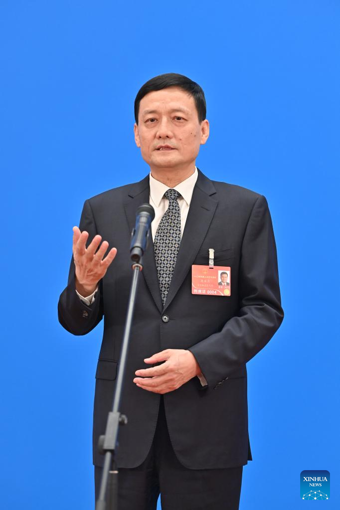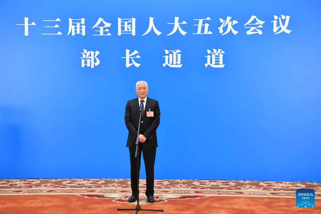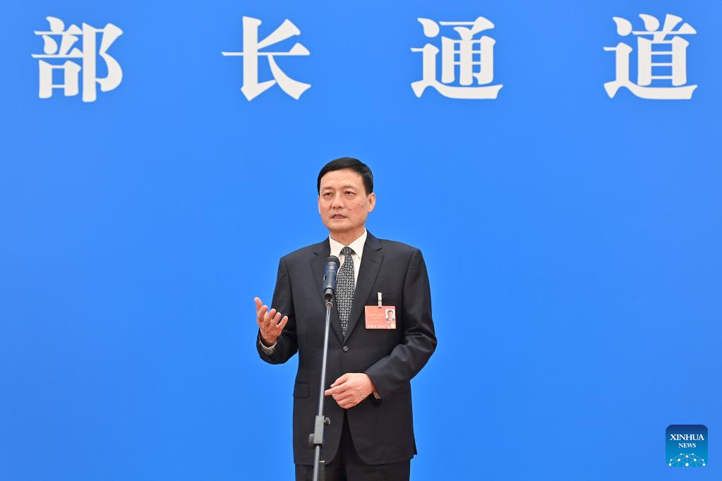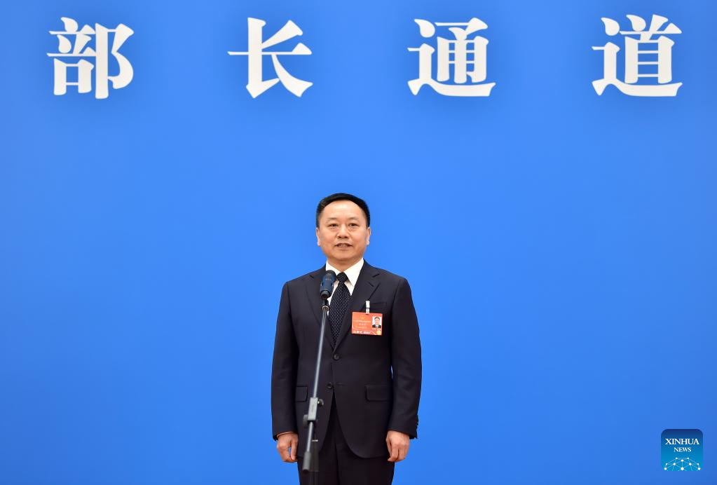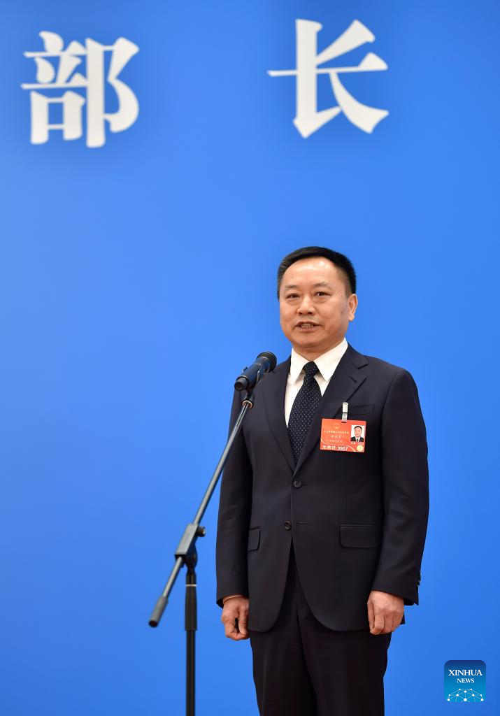 Chinese Minister of Water Resources Li Guoying attends an interview via video link after the second plenary meeting of the fifth session of the 13th National People's Congress (NPC) in Beijing, capital of China, March 8, 2022. (Xinhua/Chen Zhonghao)
