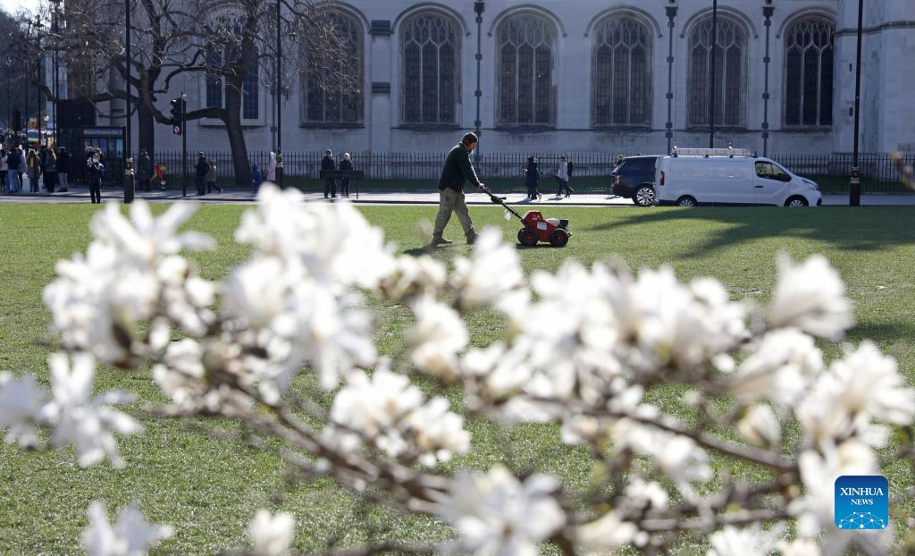 A worker mows the lawn outside Westminster Abbey in London, Britain, March 7, 2022. (Xinhua/Li Ying)