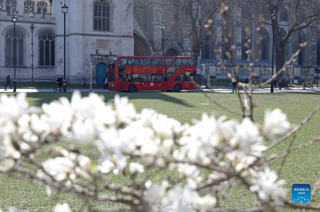 A bus runs past a lawn outside Westminster Abbey in London, Britain, March 7, 2022. (Xinhua/Li Ying)