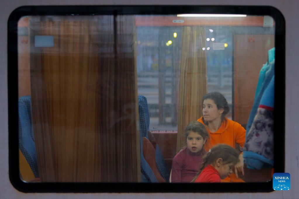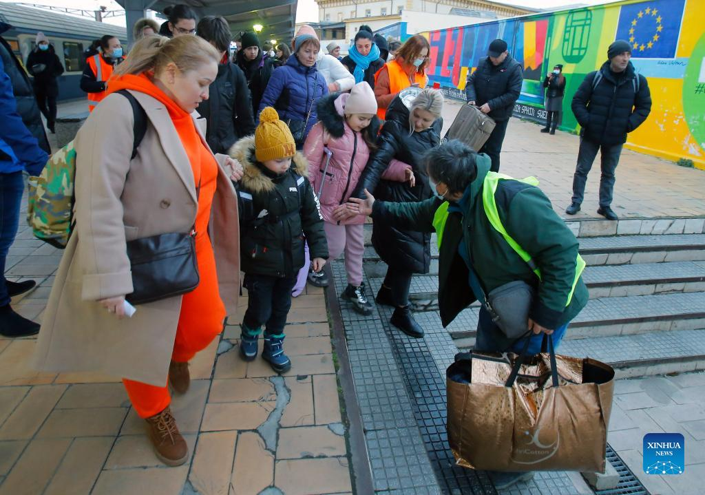 People from Ukraine arrive at a railway station in Bucharest, capital of Romania, March 7, 2022. (Photo by Cristian Cristel/Xinhua)