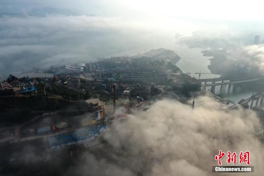Beautiful landscape of the Wine Town shrouded in heavy advection fog near the Yangtze River in Fuling district, Chongqing, March 8, 2022. (Photo: China News Service/Yang Xiaoyong)