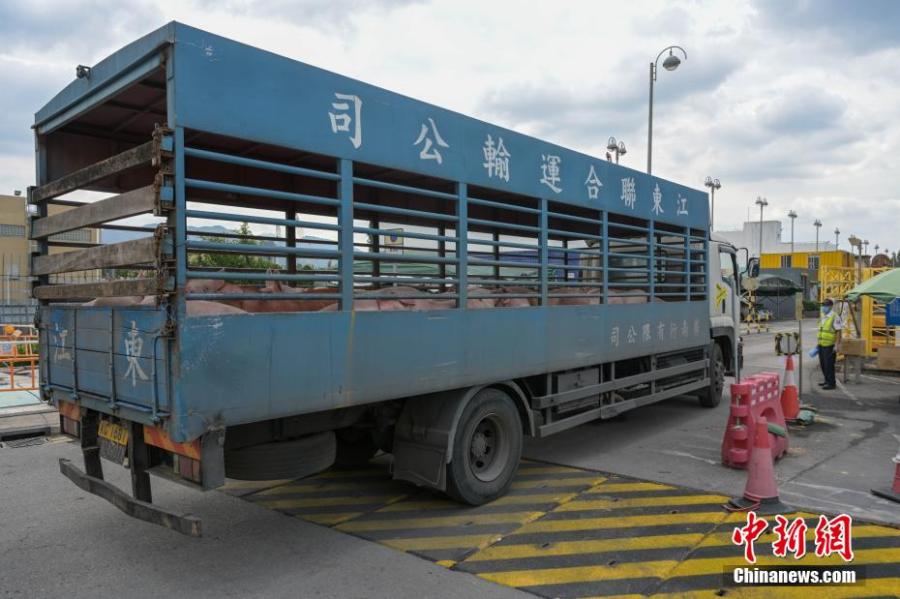 A truck carrying pigs arrives at Sheng Shui Slaughterhouse, the Hong Kong Special Administrative Region, March 7, 2022. (Photo: China News Service/Chen Yongnuo)
