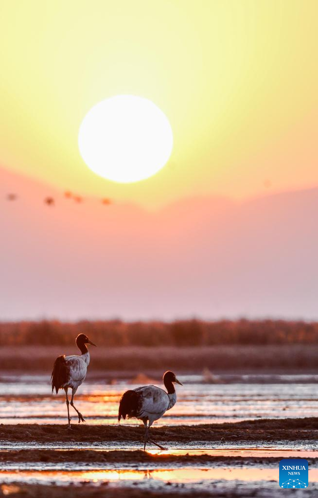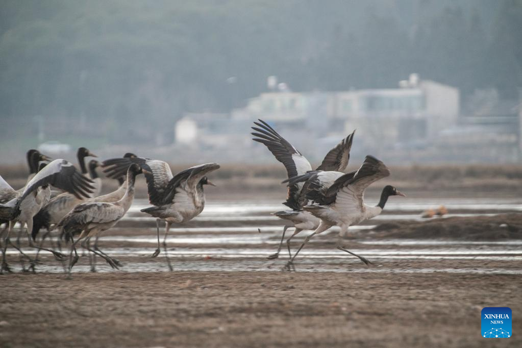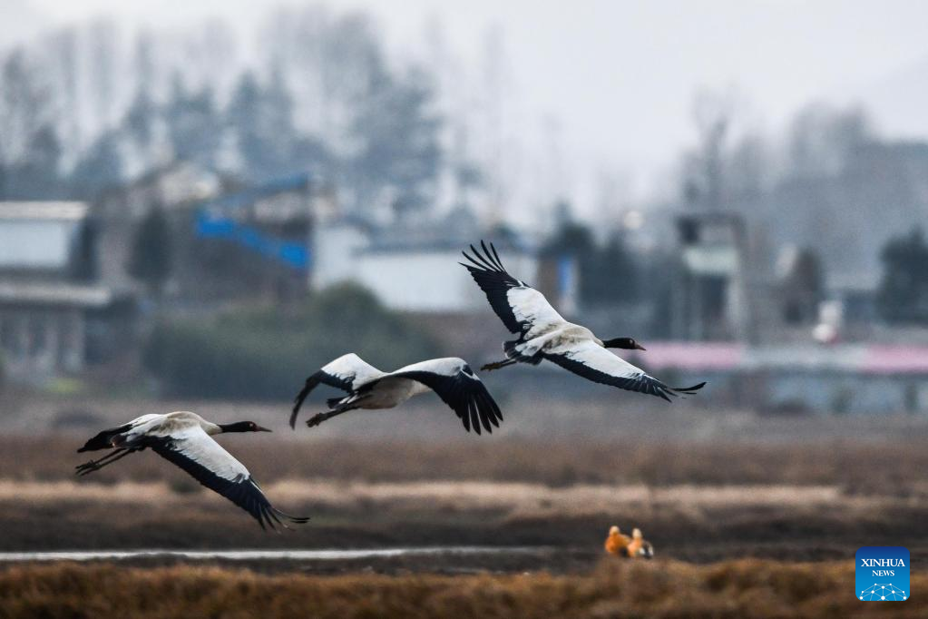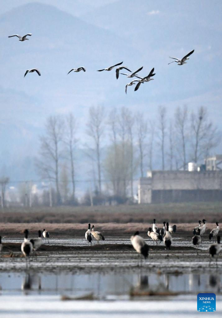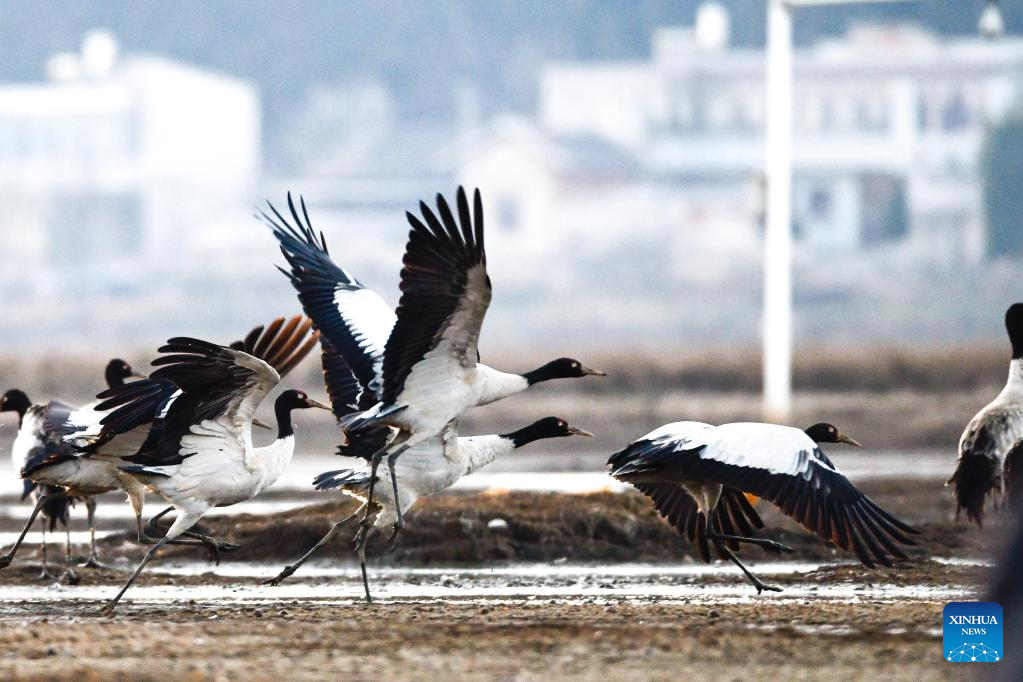 Black-necked cranes are seen at the Caohai National Nature Reserve in Weining Yi, Hui and Miao Autonomous County, southwest China's Guizhou Province, March 8, 2022. (Xinhua/Yang Wenbin)