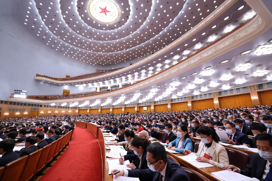 Deputies to the 13th National People's Congress (NPC) attend the second plenary meeting of the fifth session of the 13th NPC at the Great Hall of the People in Beijing, capital of China, March 8, 2022. (Xinhua/Liu Weibing)