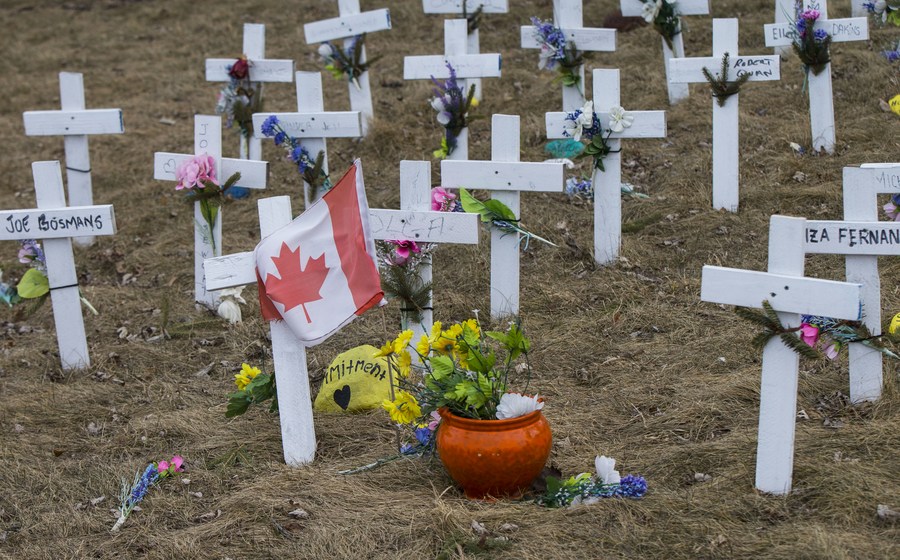 Photo taken on March 11, 2021 shows crosses for people who lost their lives due to COVID-19 outside the Camilla Care Community in Mississauga, Ontario, Canada. (Photo by Zou Zheng/Xinhua)