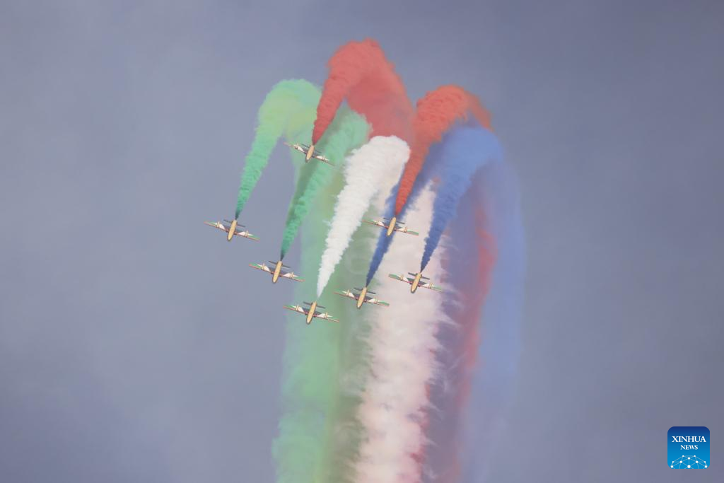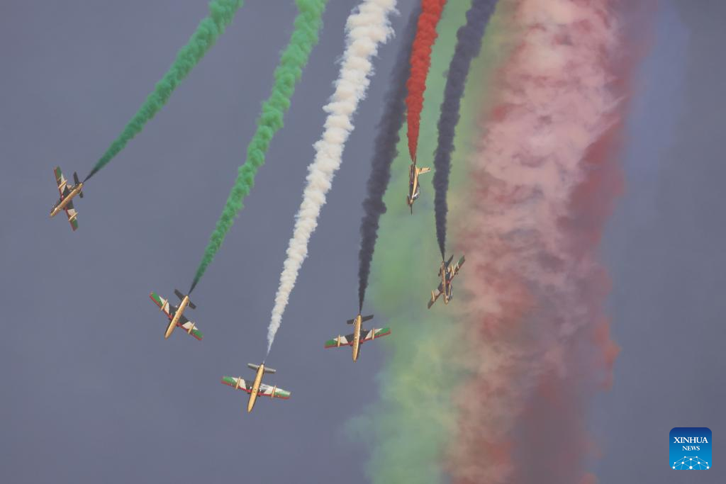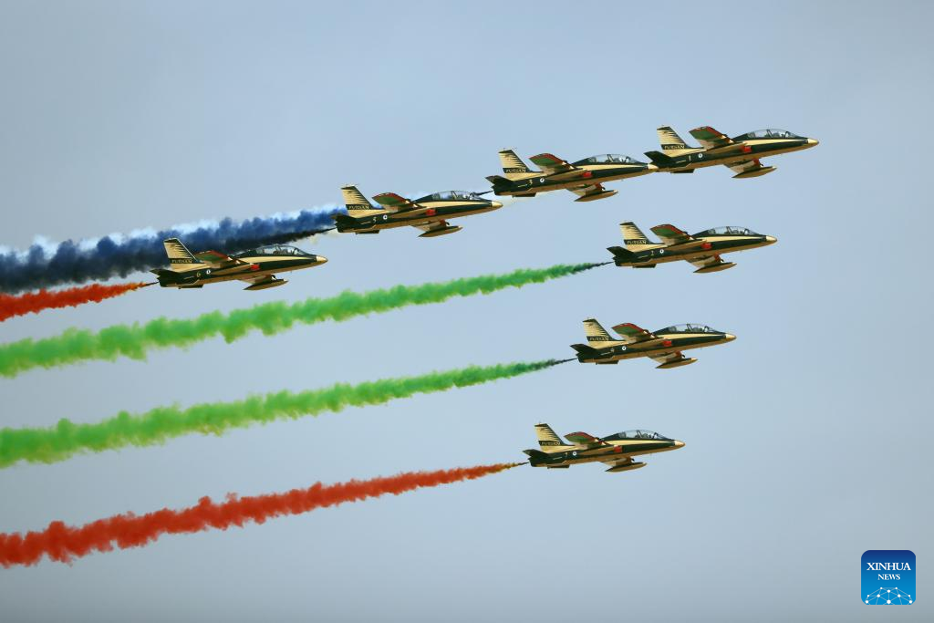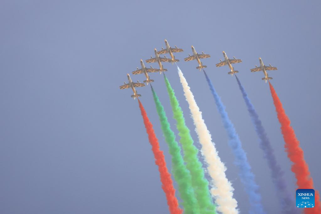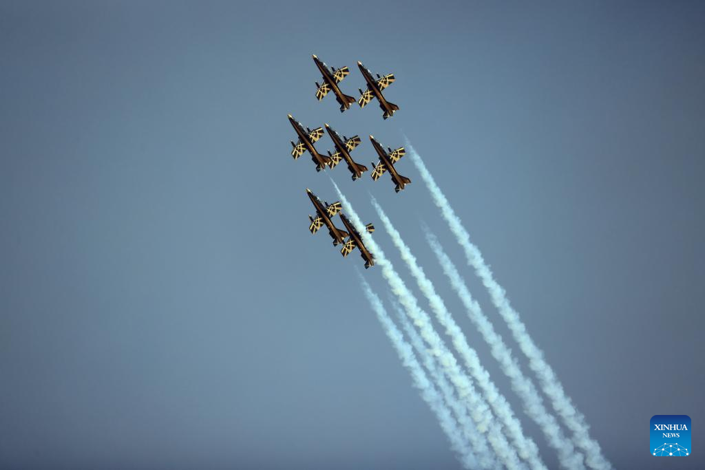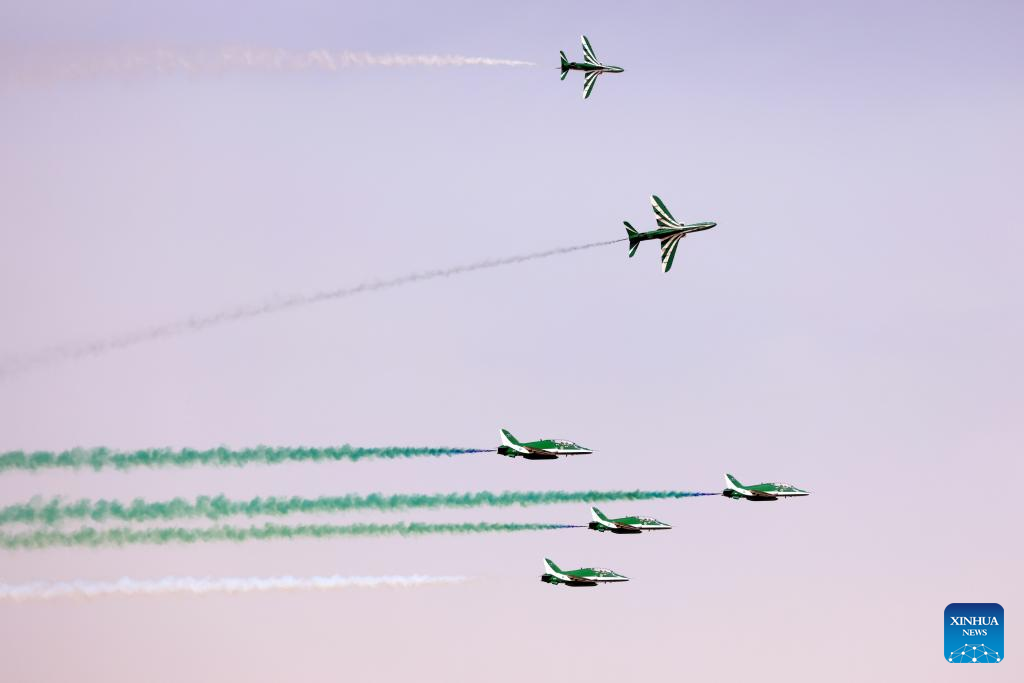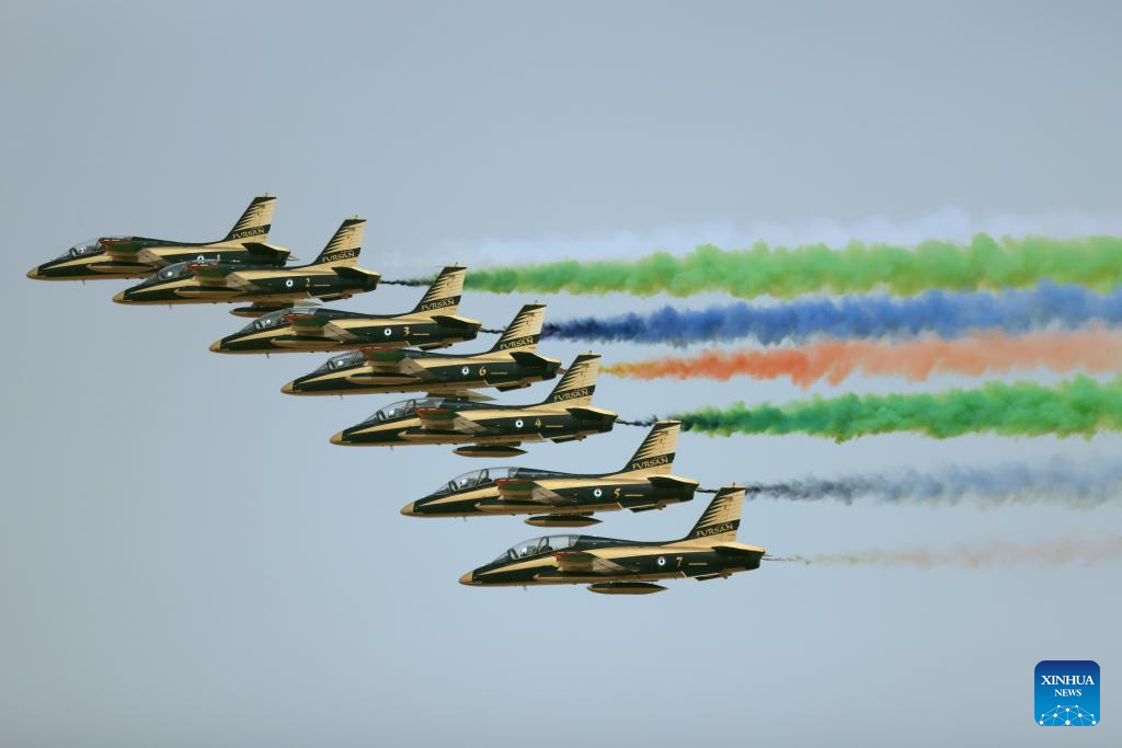 Aircraft of the Al Fursan aerobatic team perform during the first World Defense Show in Riyadh, Saudi Arabia, on March 8, 2022. (Xinhua/Wang Haizhou)