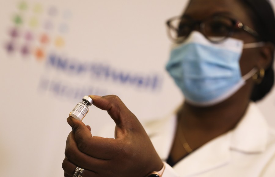 A healthcare worker shows a vial of the COVID-19 vaccine at Long Island Jewish Medical Center in New York, the United States, on Dec. 14, 2020. (Xinhua/Wang Ying)