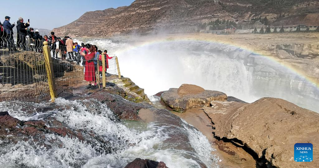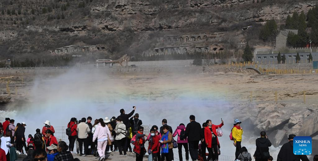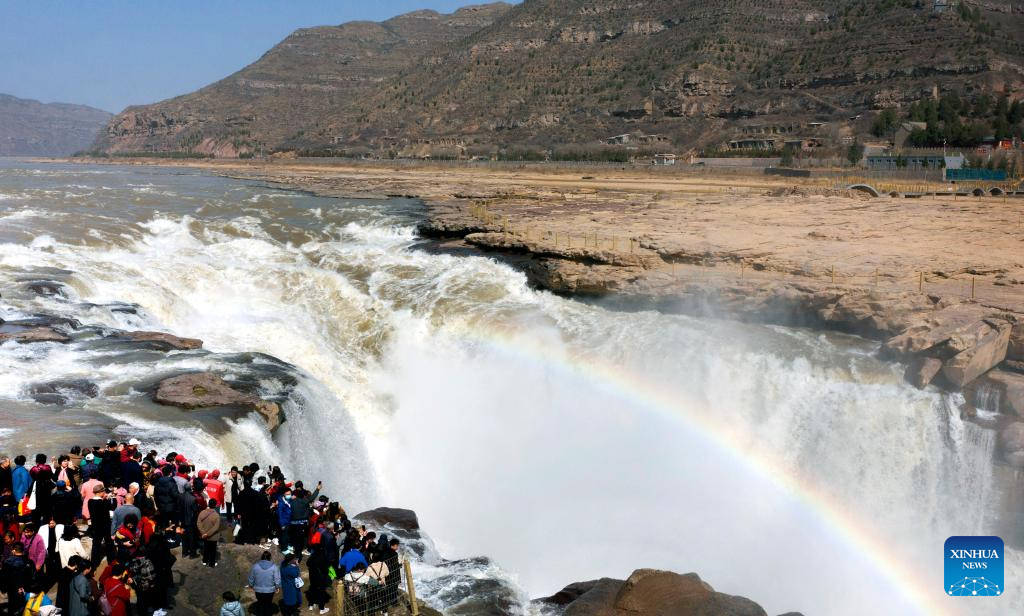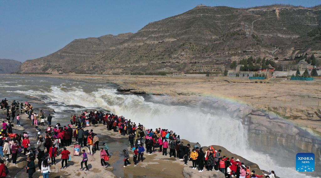 Tourists view the scenery of the Hukou Waterfall on the Yellow River in northwest China's Shaanxi Province, March 8, 2022. Hukou waterfall is witnessing increasing water flow due to warm temperature. (Xinhua/Tao Ming)