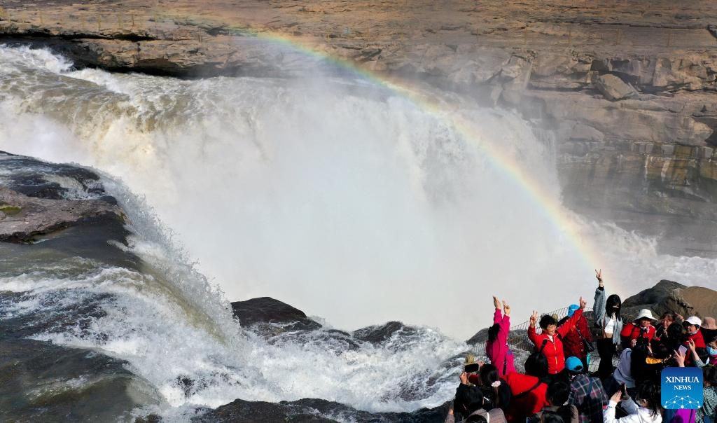 Tourists enjoy scenery of Hukou Waterfall in Shaanxi