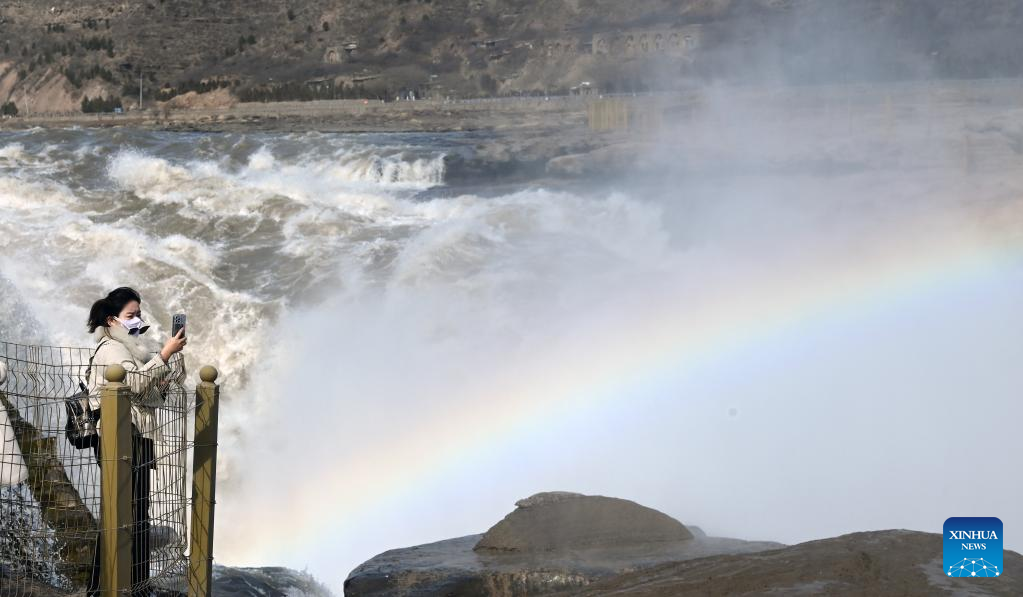 A tourist takes photos of the scenery of the Hukou Waterfall on the Yellow River in northwest China's Shaanxi Province, March 8, 2022. Hukou waterfall is witnessing increasing water flow due to warm temperature. (Xinhua/Tao Ming)