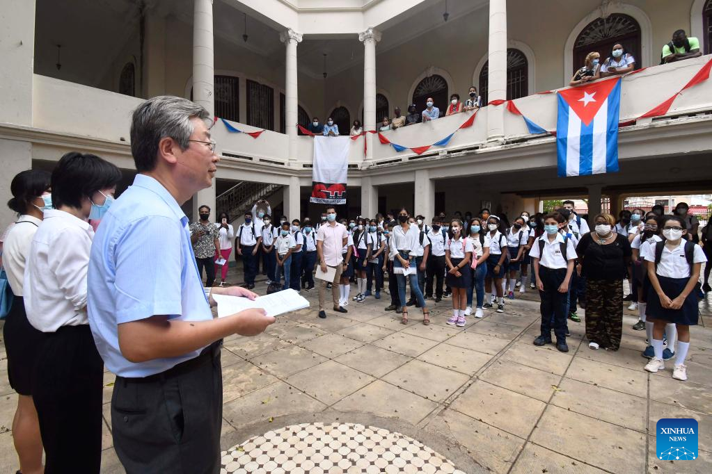 Chinese Ambassador to Cuba Ma Hui (front) delivers a speech at Fructuoso Rodriguez secondary school in Havana, Cuba, March 7, 2022. (Photo by Joaquin Hernandez/Xinhua)