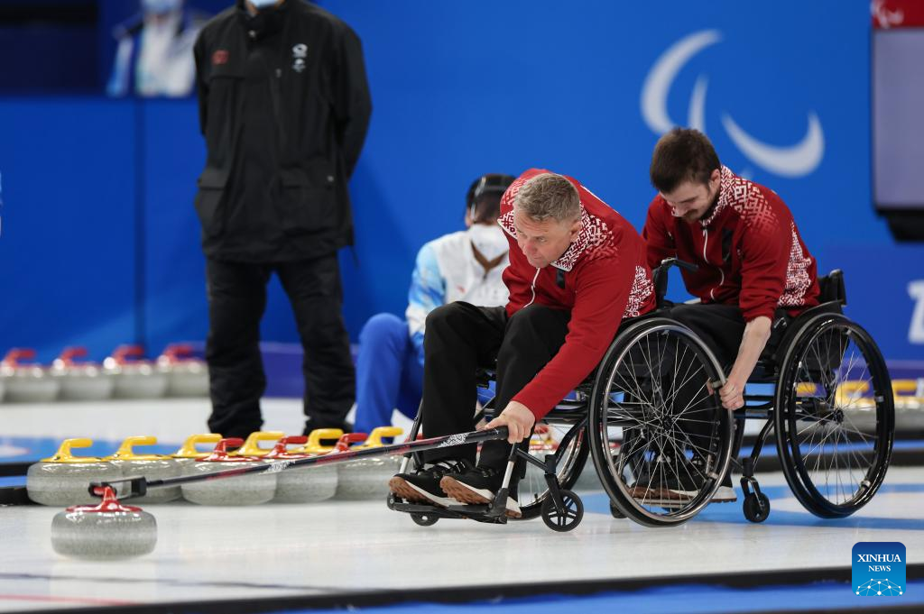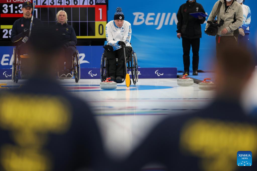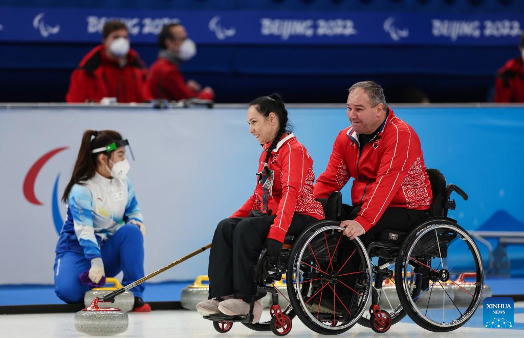 Jon Thurston (C) of Canada competes during the Wheelchair Curling Round Robin Match between South Korea and Canada of Beijing 2022 Winter Paralympics at National Aquatics Center in Beijing, capital of China, on March 8, 2022. (Xinhua/Wu Huiwo)