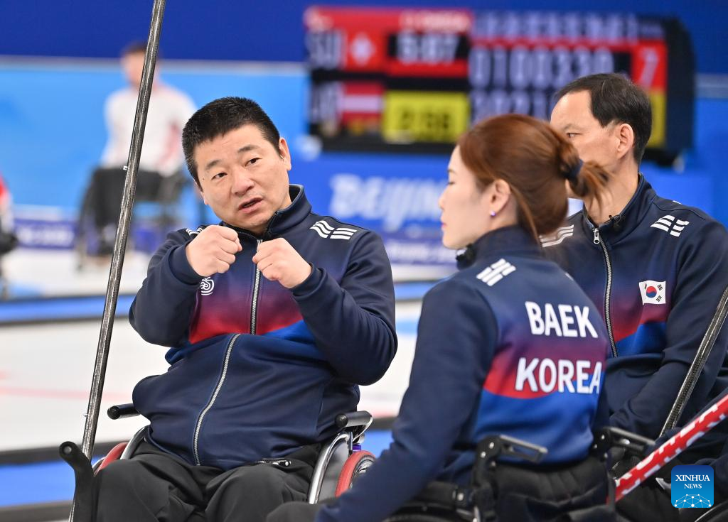 Jang Jaehyuk (2nd R) of South Korea competes during the Wheelchair Curling Round Robin Match between South Korea and Canada of Beijing 2022 Winter Paralympics at National Aquatics Center in Beijing, capital of China, on March 8, 2022. (Xinhua/Wu Huiwo)