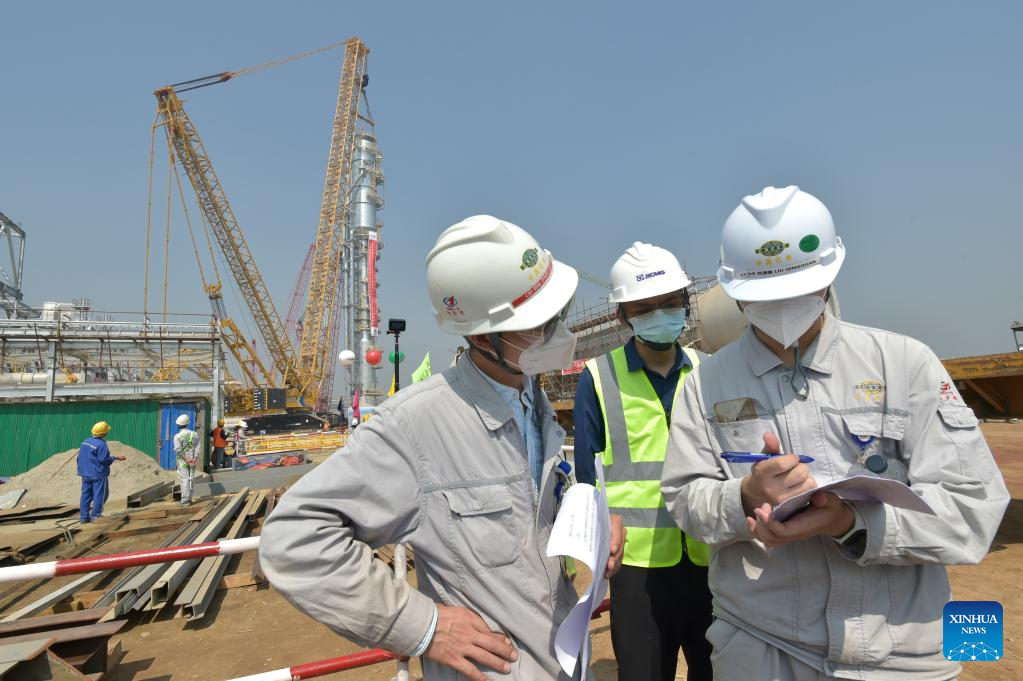 Chinese engineers monitor installation process of a carbon dioxide stripper tower at a fertilizer plant under construction in Narsingdi, Bangladesh, on March 8, 2022. The carbon dioxide stripping tower, the first super-heavy equipment of Bangladesh's Ghorashal-Polash Urea fertilizer project (GPUFP), the country's largest and first ever green fertilizer factory, was installed successfully on Tuesday. Engineers and workers from China National Chemical Engineering &Construction Corporation Seven Ltd successfully lifted and installed the tower, which is 68.5 meters high and has a self-weight of 447.5 tons. (Xinhua)