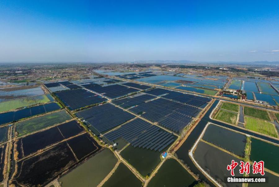 Photo shows a solar power project under construction in Tongling, east China's Anhui Province, March 7, 2022. The project, with solar panels installed above the fishery water, is expected to generate 110 million kwh of electricity per year. (Photo: China News Service/Chen Chen)