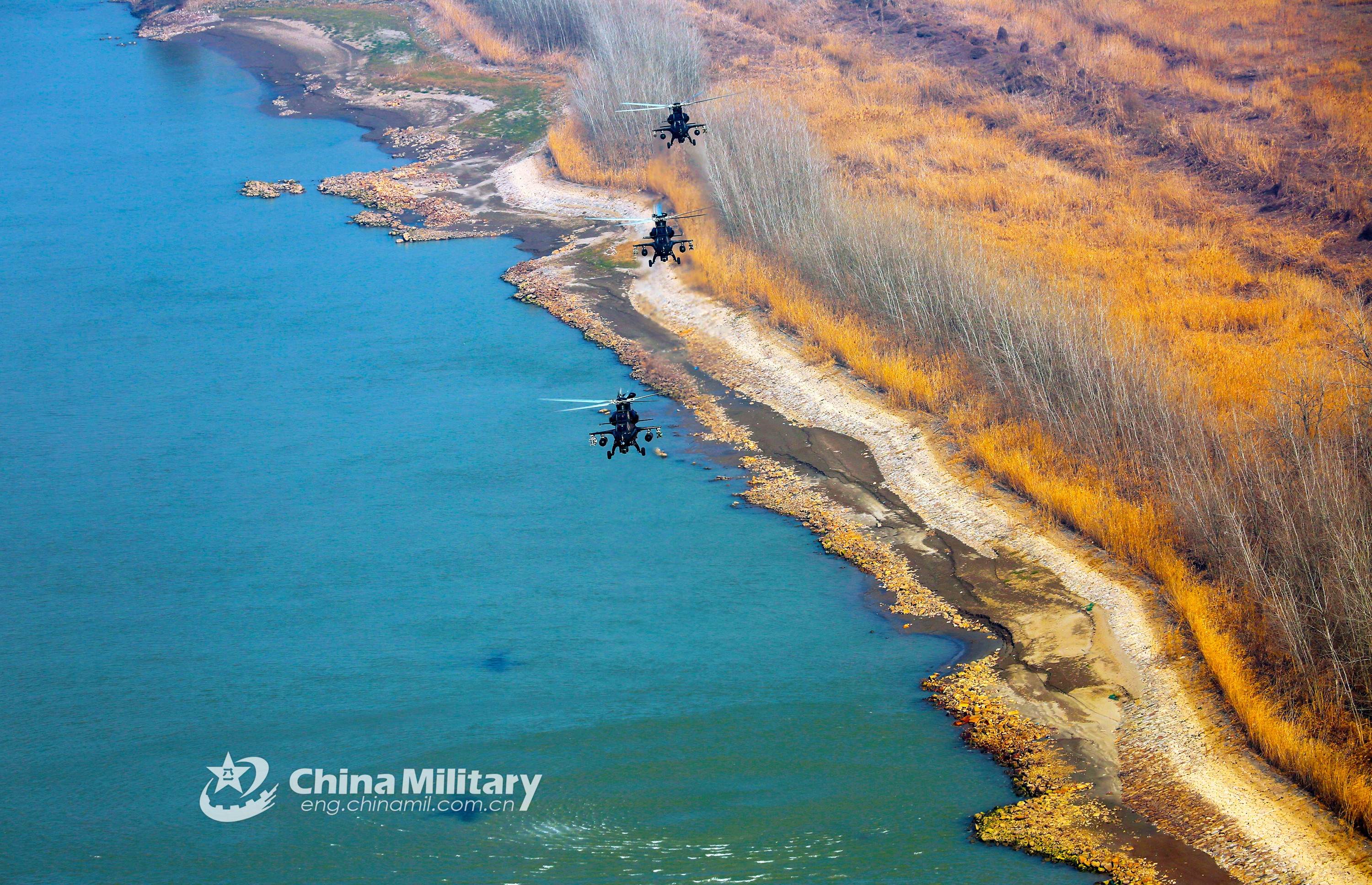 Attack helicopters attached to an army aviation brigade under the PLA 72nd Group Army fly over the river bank during a training exercise on February 17, 2022. (eng.chinamil.com.cn/Photo by Zhang Huanpeng)