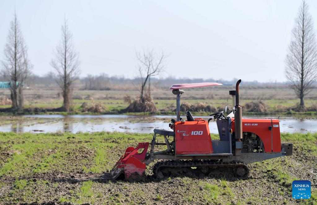 An unmanned ploughing machine works in a field of the Datian rural cooperative in Jiangxiang Town, Nanchang County of east China's Jiangxi Province, March 8, 2022. In the spring farming season, managers of Datian rural cooperative has carried out a smart farming program with the application of various unmanned devices, which has greatly improved the efficiency of agricultural production. By taking advantage of large-scale operation, mechanized production and digital management, only 26 people can govern the farms with a total area of 13,000 mu (about 866.7 hectares). (Xinhua/Peng Zhaozhi)