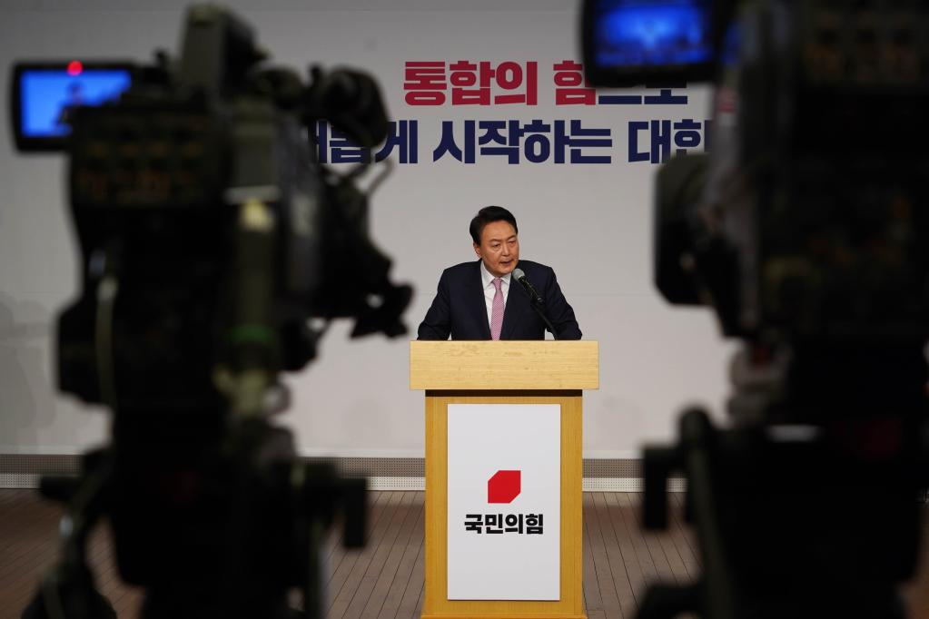 President-elect Yoon Suk-yeol speaks during a press conference at the National Assembly Library in Seoul, South Korea, March 10, 2022. Yoon Suk-yeol of the main conservative opposition People Power Party won a narrow victory in the South Korean presidential election amid people's aspiration for transfer of power. (Photo by James Lee/Xinhua)