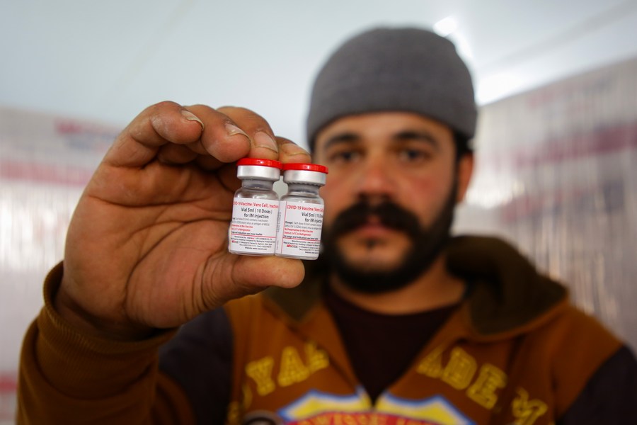 A Palestinian worker displays doses of Sinovac COVID-19 vaccines at the Palestinian Authority's storage facility in Gaza City, Feb. 21, 2022. (Photo by Rizek Abdeljawad/Xinhua)