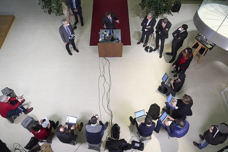 Rafael Grossi (top C), Director-General of the International Atomic Energy Agency (IAEA), briefs the press after his arrival at the Vienna International Airport, in Vienna, Austria, March 5, 2022. Iran and the IAEA on Saturday agreed on a roadmap to resolve Iran's nuclear safeguards issues by June, a vital step as talks in Vienna over reviving the 2015 Iran nuclear deal entered the final stage. (Photo by Georges Schneider/Xinhua)