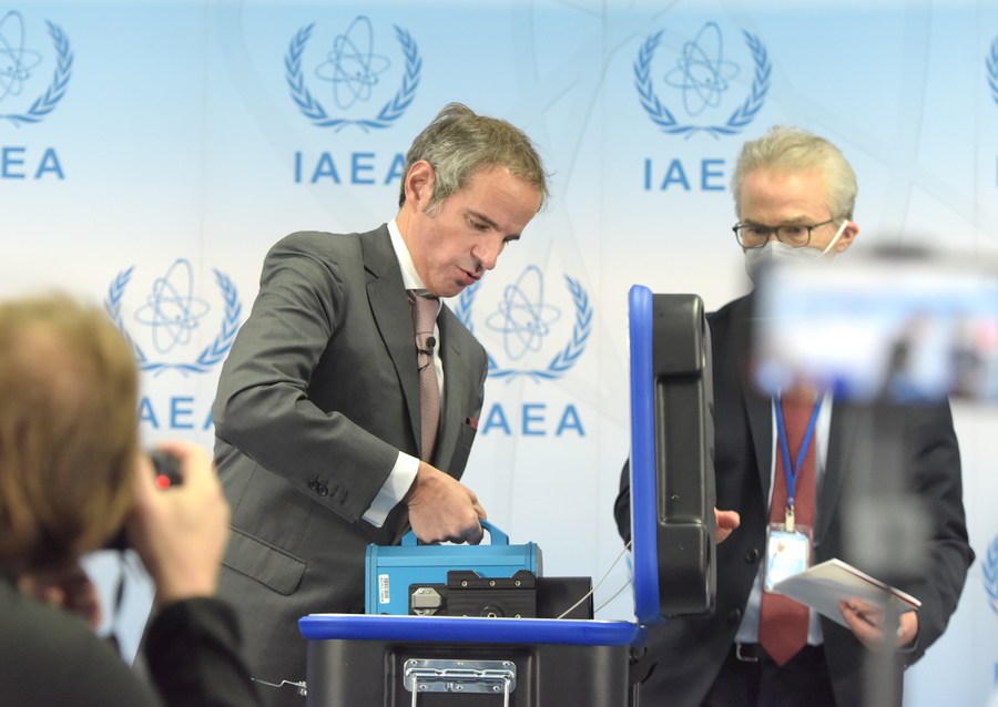 Rafael Mariano Grossi, Director General of the International Atomic Energy Agency (IAEA), displays a surveillance camera during a press conference in Vienna, Austria, Dec 17, 2021. (Xinhua/Guo Chen)