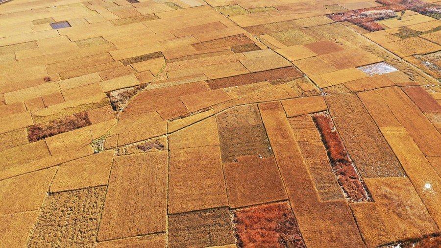 Aerial photo taken on Oct. 29, 2021 shows rice fields in Luanzhou, north China's Hebei Province. (Xinhua/Zhu Xudong)