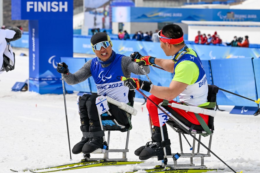 Zheng Peng (L) and Mao Zhongwu of China celebrate after the Para cross-country skiing men's sprint sitting final of Beijing 2022 Winter Paralympics. (Xinhua/Li Bo)