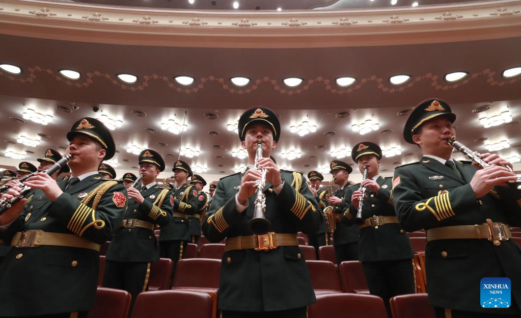 The military band of the Chinese People's Liberation Army performs during the closing meeting of the fifth session of the 13th National Committee of the Chinese People's Political Consultative Conference (CPPCC) at the Great Hall of the People in Beijing, capital of China, March 10, 2022. (Xinhua/Lu Ye)