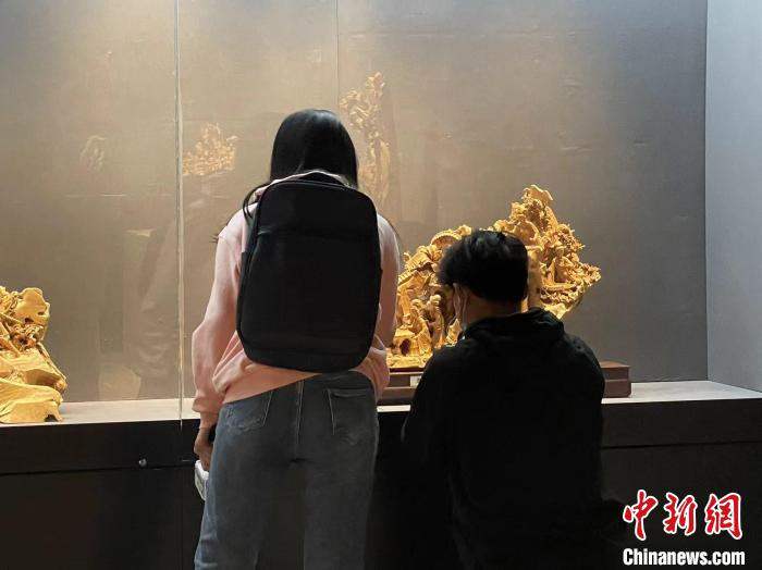 Visitors at an exhibition view boxwood carving works by Zheng Songqiang. (Photo/Tong Xiaoyu)