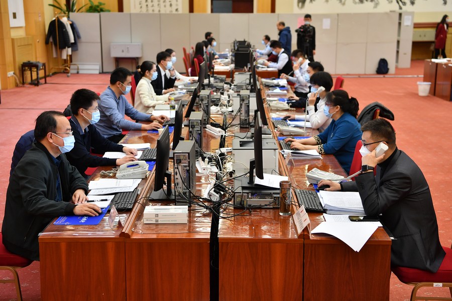 Staff members of the secretariat of the fifth session of the 13th NPC sort out suggestions from lawmakers in Beijing, capital of China, March 9, 2022. (Xinhua/Li Xin)