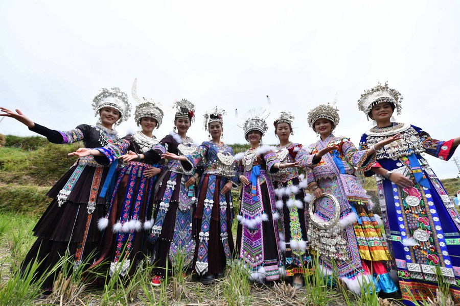 Women of the Miao ethnic group show their costumes during an event celebrating the harvest season in Rongshui Miao Autonomous County, south China's Guangxi Zhuang Autonomous Region, Oct. 15, 2021. (Xinhua/Huang Xiaobang)