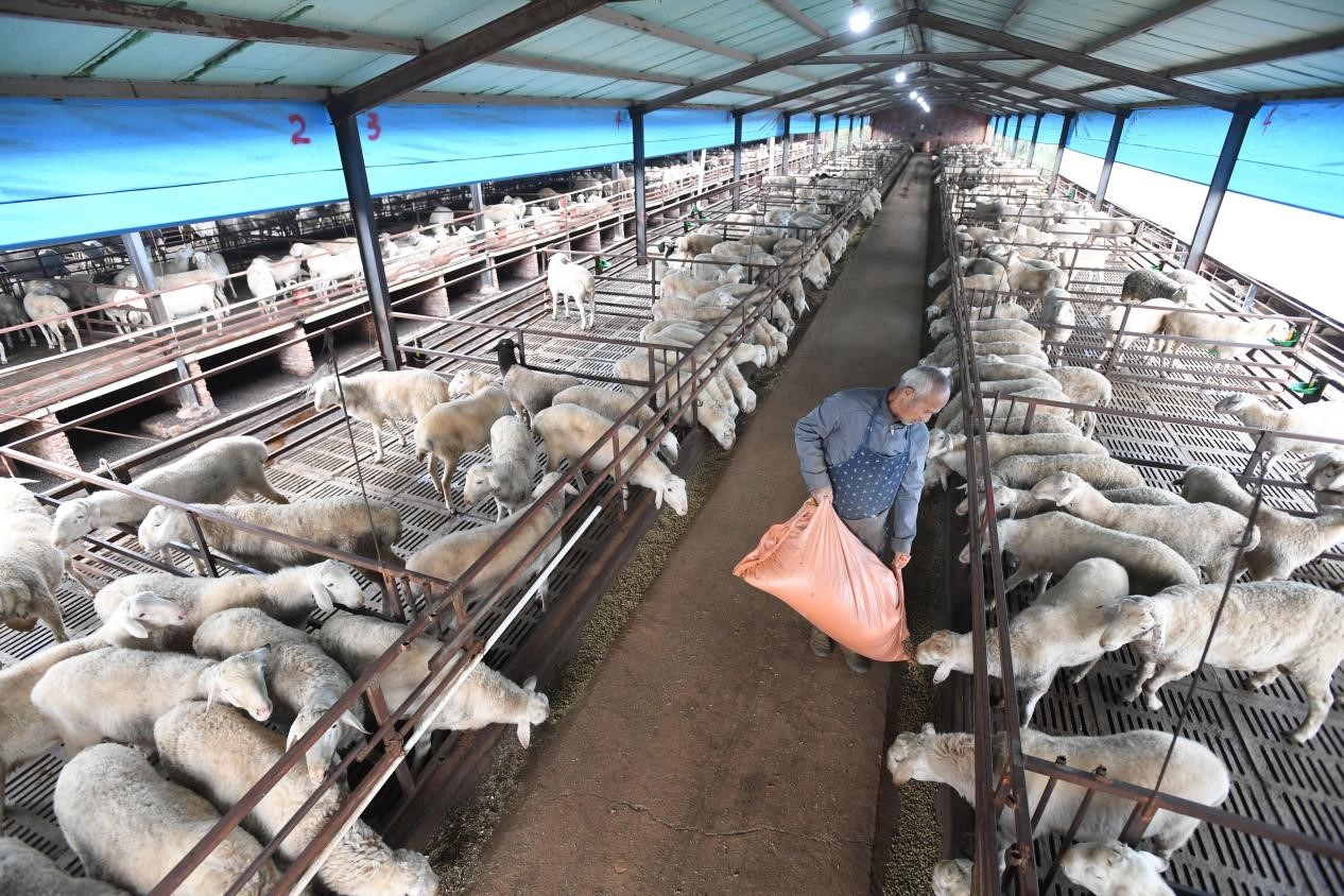 A man is feeding sheep at a sheep farm in Beikeng village, Liugongmiao township, Zhangshu, east China's Jiangxi province, Nov. 22, 2021. (People's Daily Online/Zhou Liang)