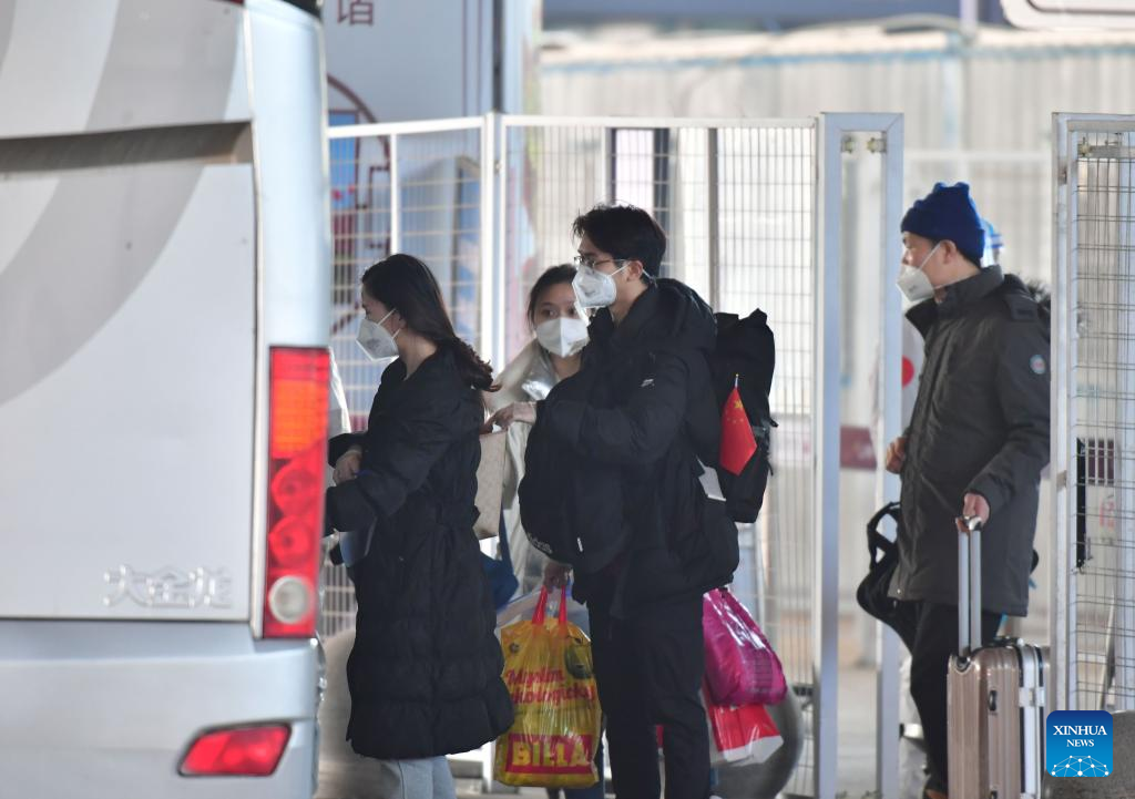 Chinese citizens evacuated from Ukraine board a shuttle bus that will take them to a quarantine hotel upon arriving at Taoxian International Airport in Shenyang, northeast China's Liaoning Province, March 11, 2022. The tenth temporary flight carrying Chinese citizens evacuated from Ukraine returned home safely on Friday. (Xinhua/Yang Qing)