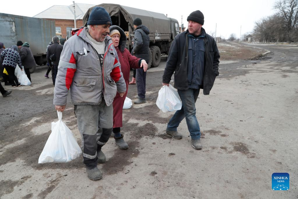 Local residents receive humanitarian aid in the village of Anadol in Donetsk, on March 10, 2022. (Photo by Victor/Xinhua)