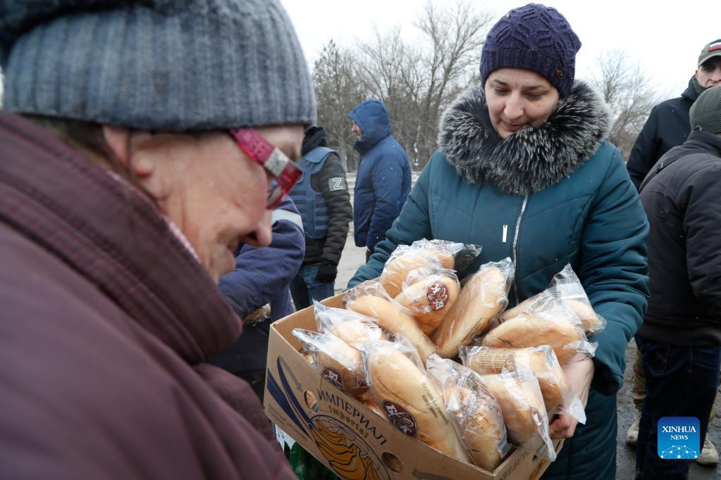A woman distributes bread to residents of the village of Anadol in Donetsk, on March 10, 2022. (Photo by Victor/Xinhua)