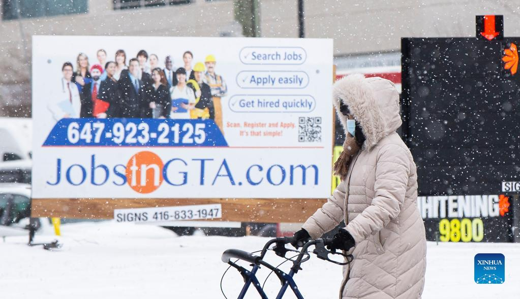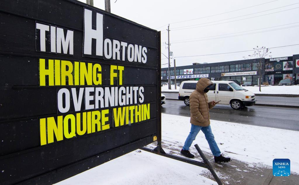 A man walks past a job board on a street in Toronto, Ontario, Canada, on March 11, 2022. Canada's unemployment rate fell to 5.5 percent in February 2022, lower than 5.7 percent in February 2020 and similar to the record low of 5.4 percent observed in May 2019, Statistics Canada said Friday. (Photo by Zou Zheng/Xinhua)