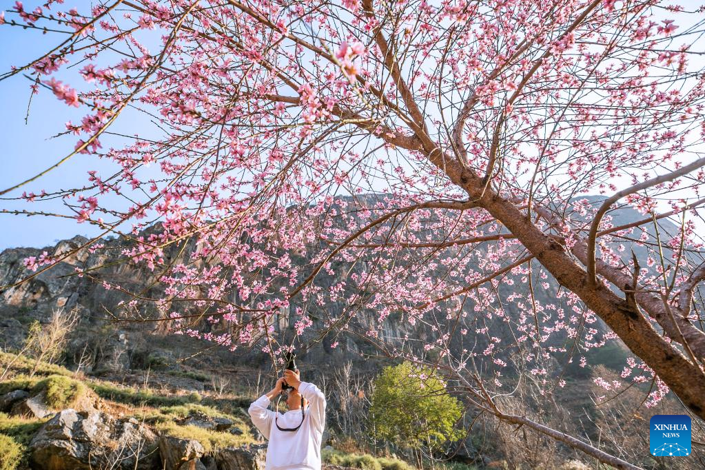 A man takes photos of peach blossoms in Huaguo Village, Haila Township, Weining Yi, Hui and Miao Autonomous County, southwest China's Guizhou Province, March 10, 2022. (Photo by Luo Dafu/Xinhua)