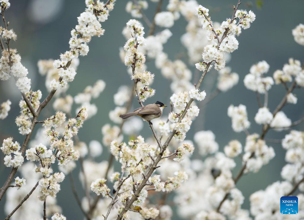 A bird perches on the branch of a flowering tree in Xiaoche River Urban Wetland Park in Guiyang, capital of southwest China's Guizhou Province, March 10, 2022. (Photo by Deng Gang/Xinhua)