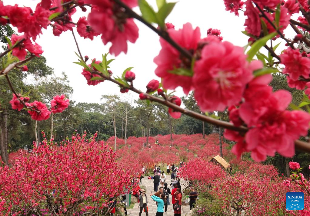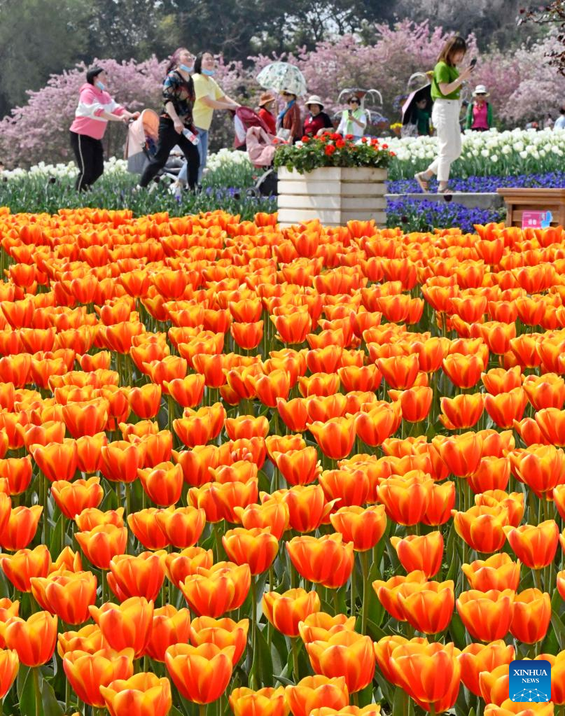 People view blooming flowers at Qingxiu Mountain Park in Nanning, south China's Guangxi Zhuang Autonomous Region, March 10, 2022. (Photo by Yu Xiangquan/Xinhua)