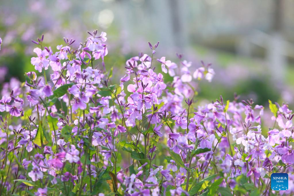 People view blooming flowers in Chengdu, southwest China's Sichuan Province, March 10, 2022. (Photo by Li Xiangyu/Xinhua)
