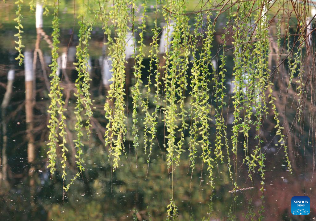 A weeping willow is seen in the Xuanwu Lake scenic spot in Nanjing, capital of east China's Jiangsu Province, March 10, 2022. (Photo by Liu Jianhua/Xinhua)
