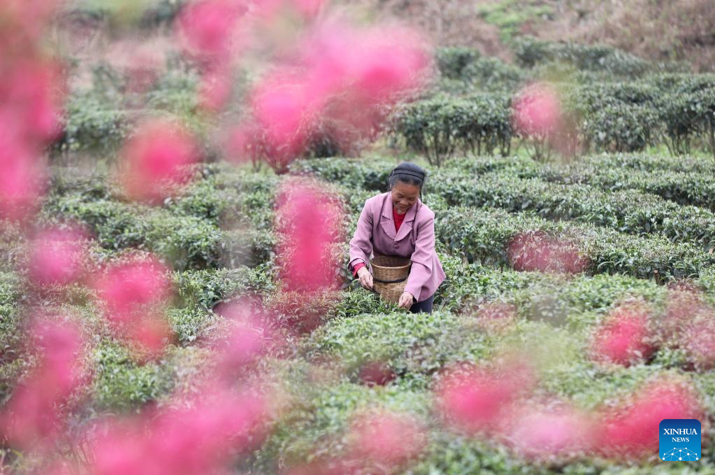 A woman picks tea leaves at a tea garden in Banliu Village, Heping Township, Sanjiang Dong Autonomous County in Liuzhou City, south China's Guangxi Zhuang Autonomous Region, March 10, 2022. (Photo by Gong Pukang/Xinhua)