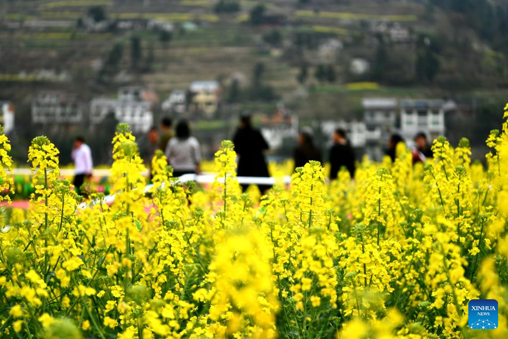 People have fun amid rapeseed flowers in Daxing Village, Shixi Township, Tongzi County, southwest China's Guizhou Province, March 10, 2022. (Photo by Luo Xinghan/Xinhua)