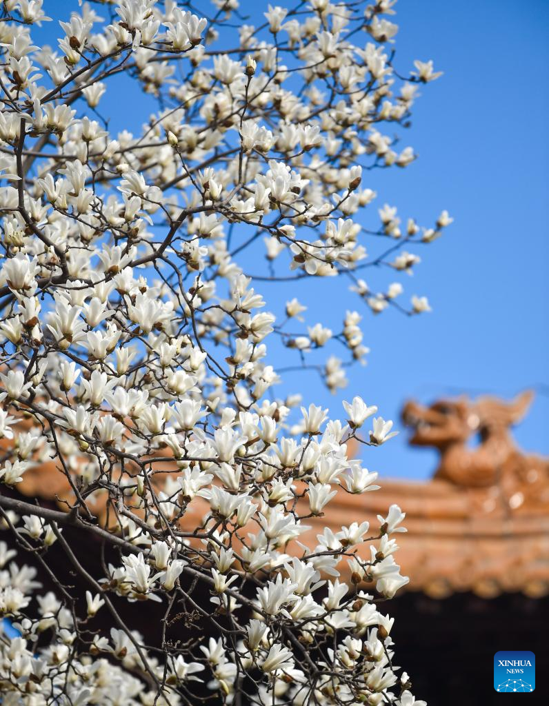 Magnolia flowers are seen in full bloom in Nanjing, capital of east China's Jiangsu Province, March 10, 2022. (Photo by Fang Dongxu/Xinhua)