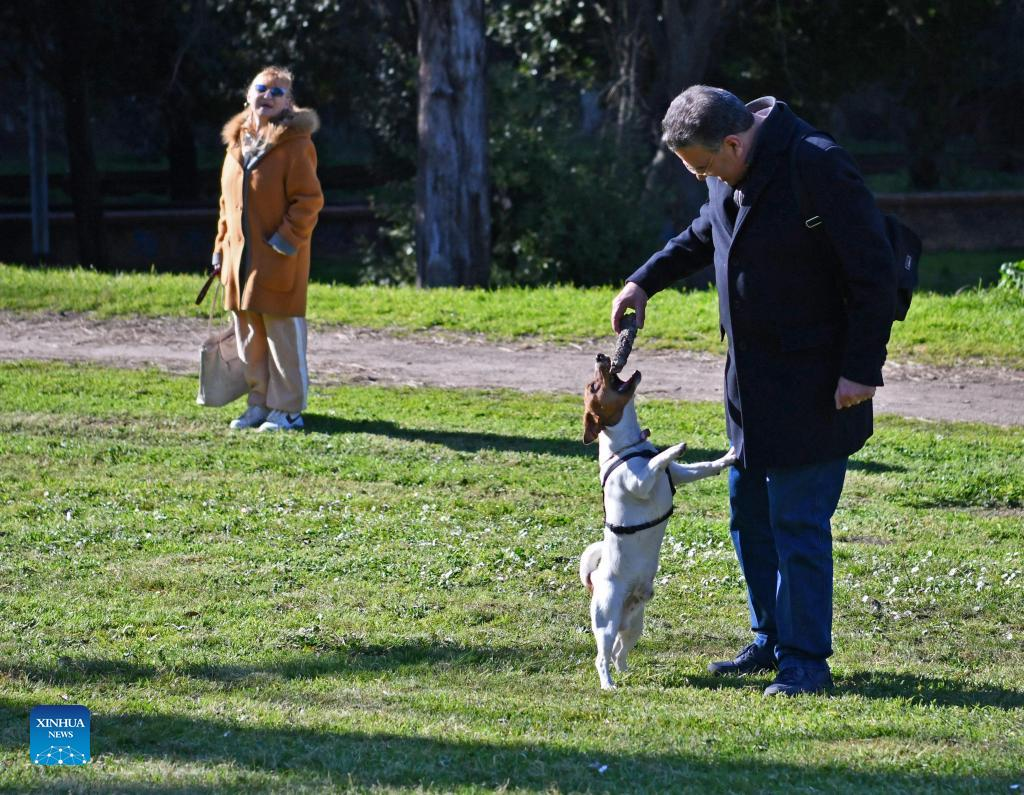 A man plays with his dog at Villa Borghese in Rome, Italy, on March 10, 2022. (Xinhua/Jin Mamengni)