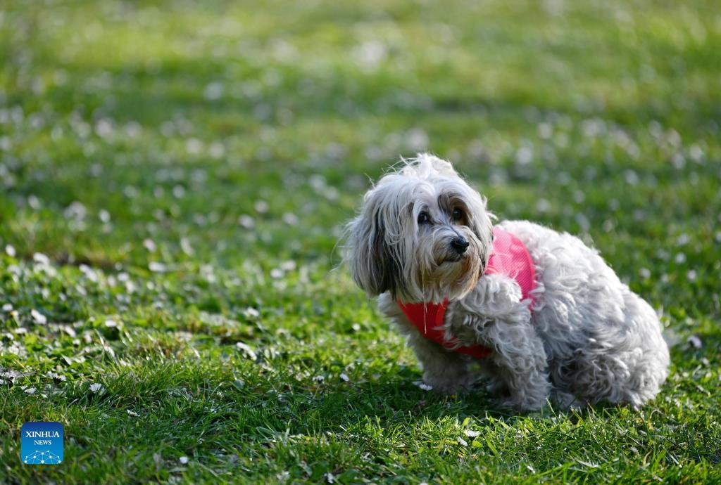 A dog enjoys sunshine at Villa Borghese in Rome, Italy, on March 11, 2022. (Xinhua/Jin Mamengni)