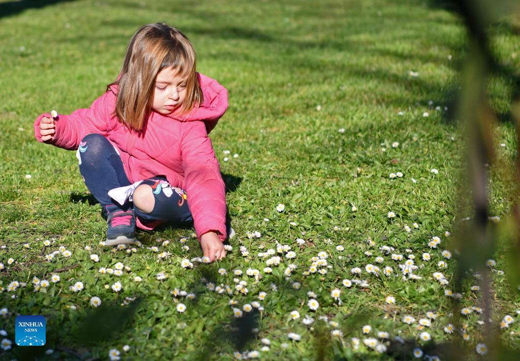 A girl enjoys leisure time at Villa Borghese in Rome, Italy, on March 10, 2022. (Xinhua/Jin Mamengni)