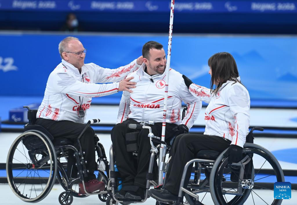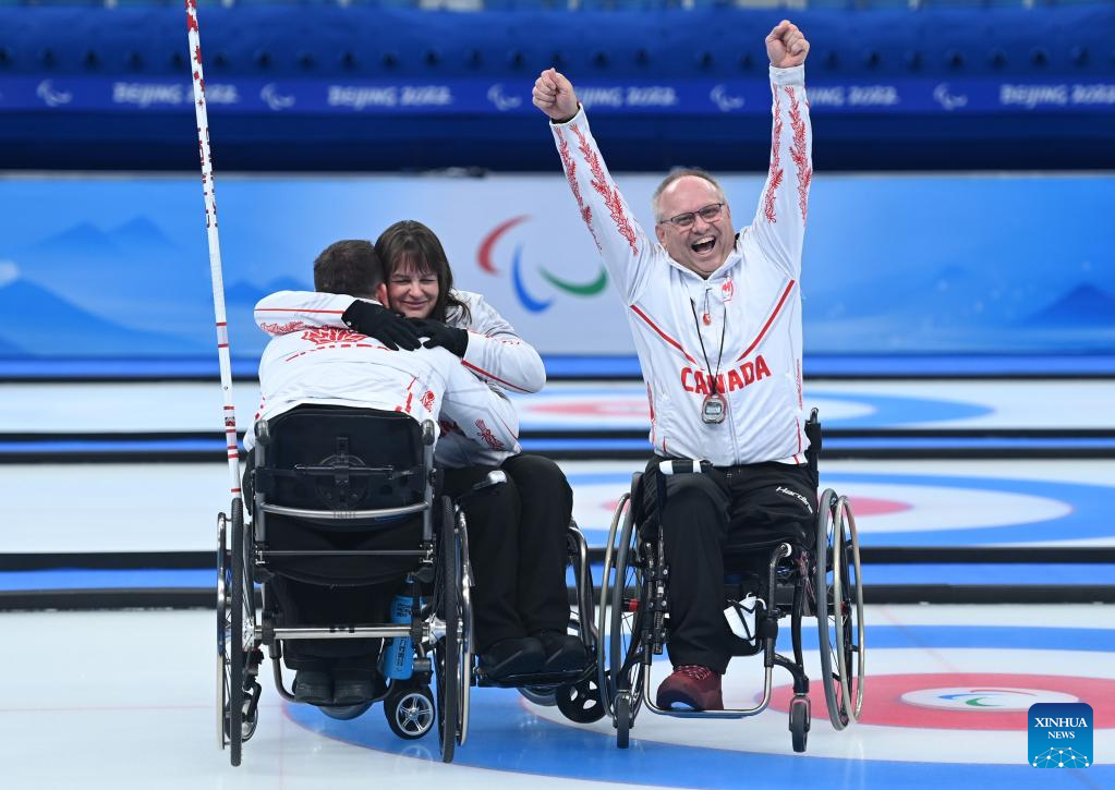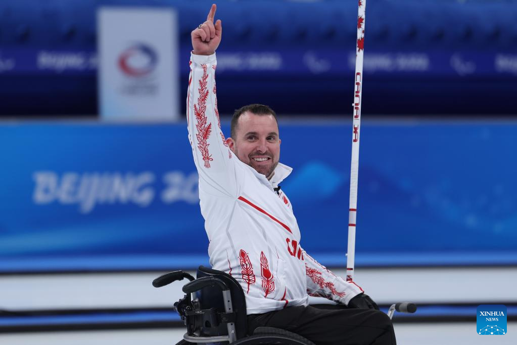 Jon Thurston of Canada celebrates after the Wheelchair Curling Bronze Medal Match between Slovakia and Canada of Beijing 2022 Winter Paralympics at National Aquatics Centre in Beijing, capital of China, on March 11, 2022. (Xinhua/Xu Yanan)