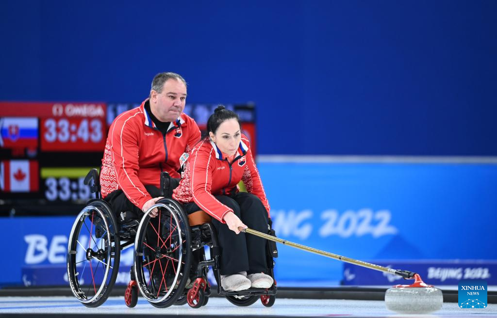 Monika Knukelova (R) of Slovakia competes during the wheelchair curling Bronze Medal Match between Slovakia and Canada of Beijing 2022 Winter Paralympic Games at National Aquatics Centre in Beijing, capital of China, on March 11, 2022. (Xinhua/Ren Chao)