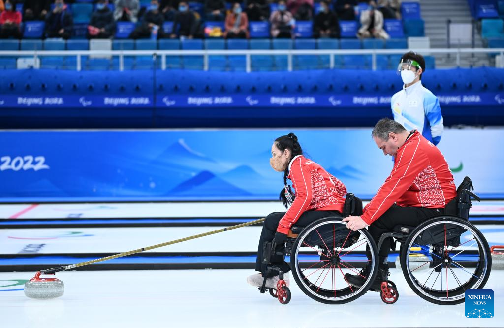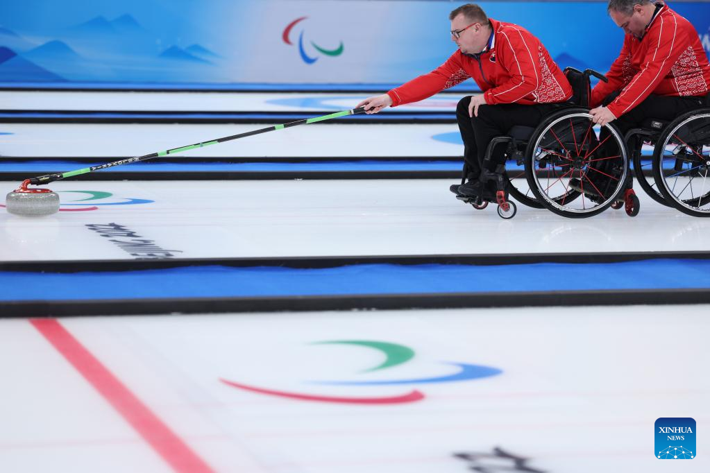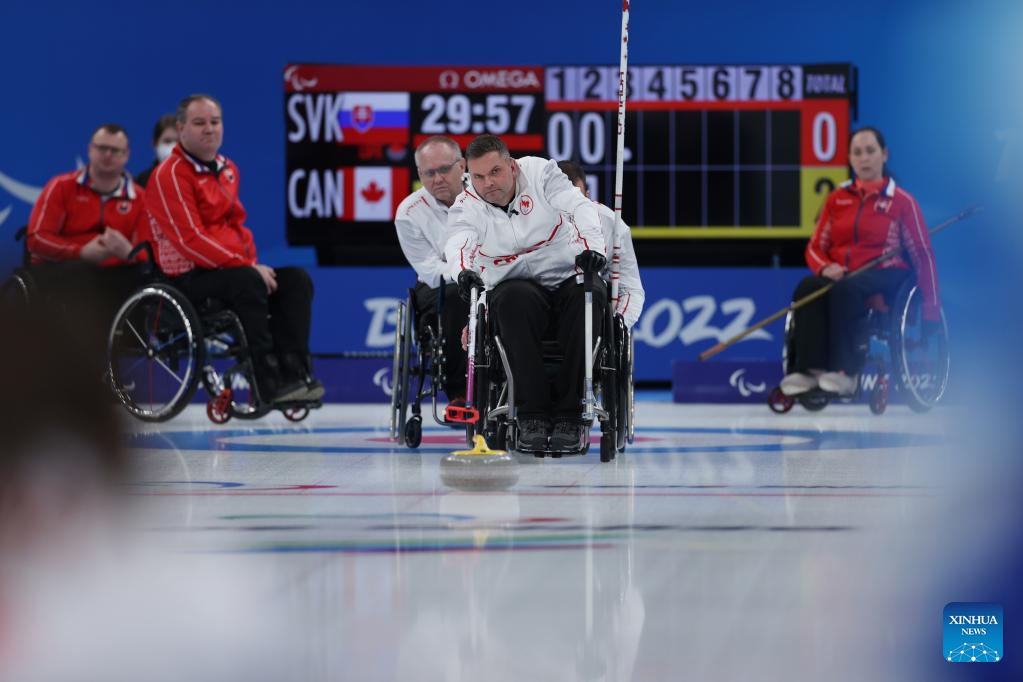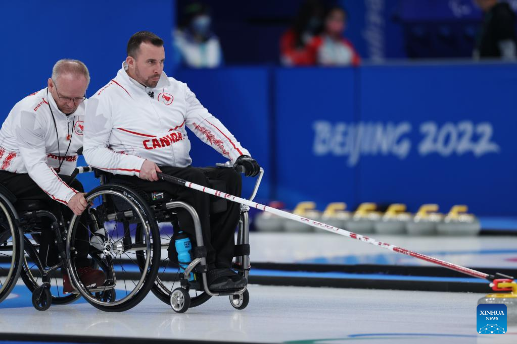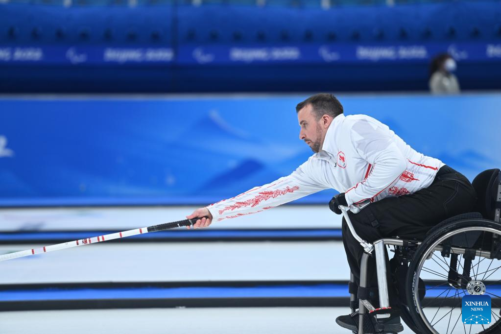 Jon Thurston (R) of Canada competes during the Wheelchair Curling Bronze Medal Match between Slovakia and Canada of Beijing 2022 Winter Paralympics at National Aquatics Centre in Beijing, capital of China, on March 11, 2022. (Xinhua/Xu Yanan)